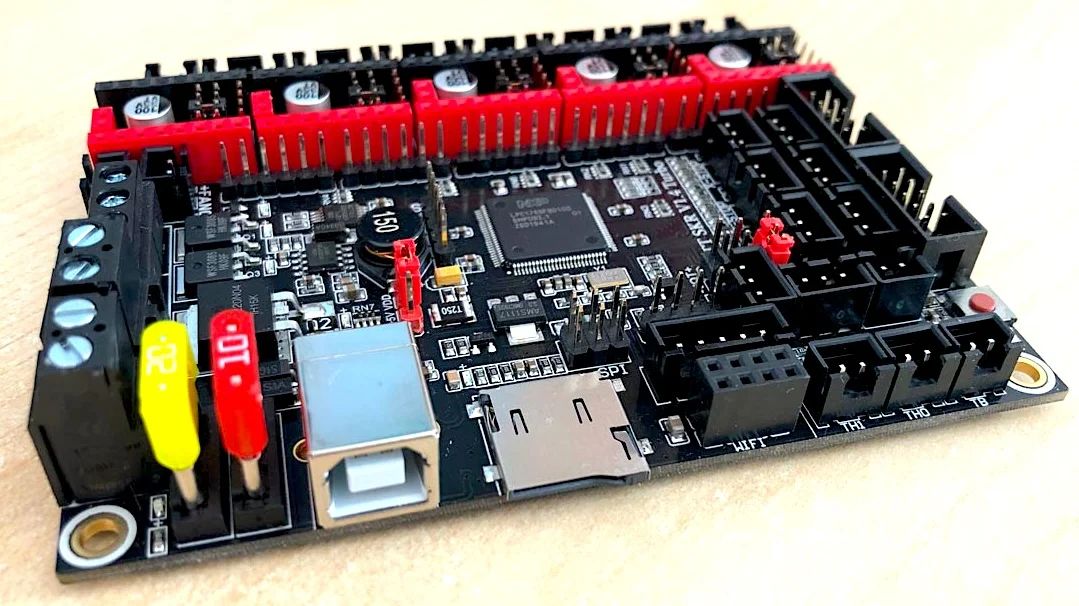 Today’s motherboards, such as SKR Mini E3, use 32-bit processors to quickly calculate complex motion paths. They are also equipped with an Ethernet module or WiFi that enables remote monitoring of 3D prints.