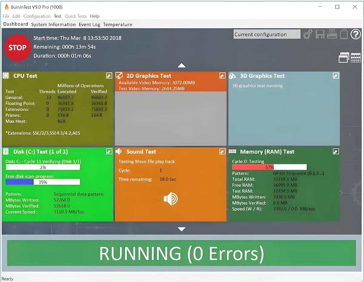 PassMark BurnInTest allows you to stress test all the major subsystems for endurance, stability, and reliability. It tests CPU, GPU, RAM, SSDs, hard disk drives, optical drives, printers, network ports, and sound cards.