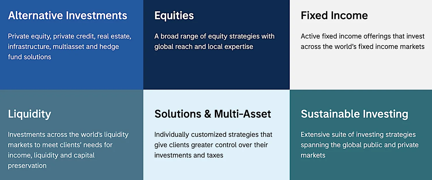 It manages a wide range of investment offerings, including active and passive strategies, alternatives, multi-asset, private markets, thematic funds, cash, liquidity, and short-term instruments. Plus, it serves a diversified set of clients, ranging from institutions and pension funds to high-net-worth individuals.