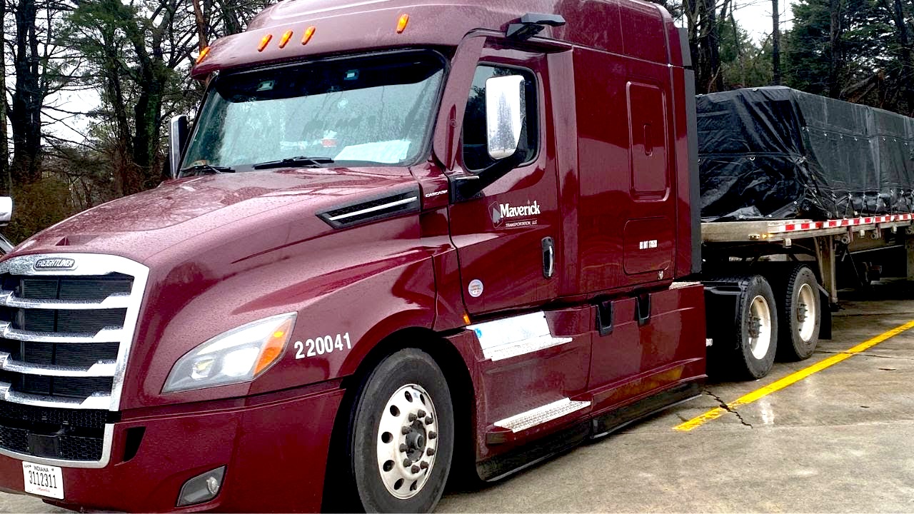 All Maverick trucks are maroon (in color) and equipped with collision mitigation, lane departure, and roll stability control technology. All have properly secured loads, impeccably clean exteriors, and a professional driver behind the wheel.