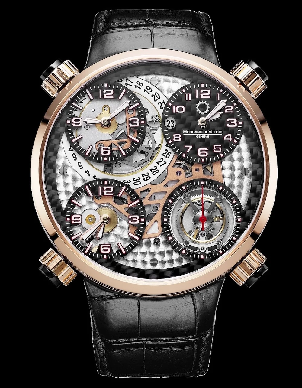 Meccaniche Veloci’s timepieces are inspired by the mechanics of motor racing, especially engines and pistons. The visual DNA of its watches immediately reflects this ethos: cases are often shaped like engine pistons or cylinder heads, and dials are evocative of automotive gauges.